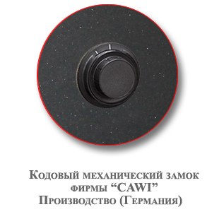 В моделях шкафов с индексом «кр» — установлен кодовый механический замок фирмы «CAWI» (пр-во Германия) с ригельной системой запирания, приводимой в действие при помощи ручки; в моделях с индексом «Ер» — установлен кодовый электронный замок фирмы «CAWI» (пр-во Германия) с ригельной системой запирания, также приводимой в действие при помощи ручки.