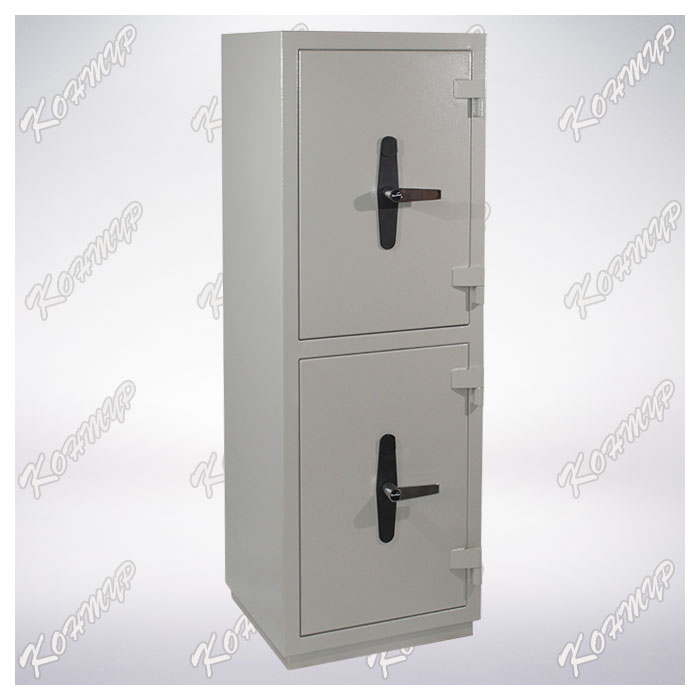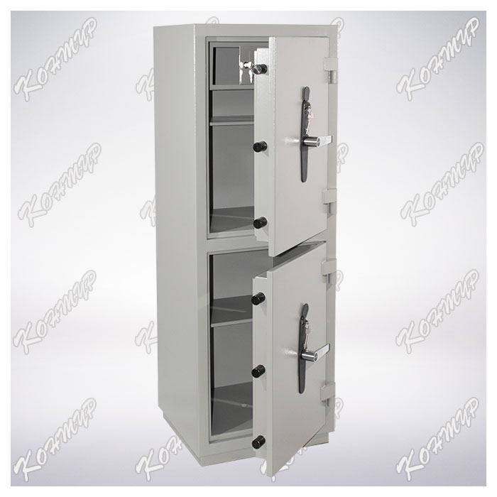 Сейф «КЗ 233т» имеет 2 независимых отделения, запираемых собственной дверью. В верхнем отделении располагается отсек ограниченного доступа (трейзер), запираемый на замок «почтового» типа и одна полка, в нижнем – одна полка.В дне сейфа предусмотрено отверстие Ø11 мм для возможности анкерного крепления его к полу. Каждая дверь сейфа оборудована запорным механизмомс 2-х сторонней ригельной системой запирания (по 3 ригеля Ø28 мм вправо/влево), который блокируется ключевым сейфовым замком класса «А» фирмы «CAWI» или «MAUER» производства Германии. Запорный механизм приводится в действие при помощи ручки. Чтобы открыть сейф необходимо: вставить ключ в замочную скважину, открыть замок и повернуть ручку на 90°. Закрывать в обратном порядке. Петли сейфа наружные, открывание двери – на 180°.