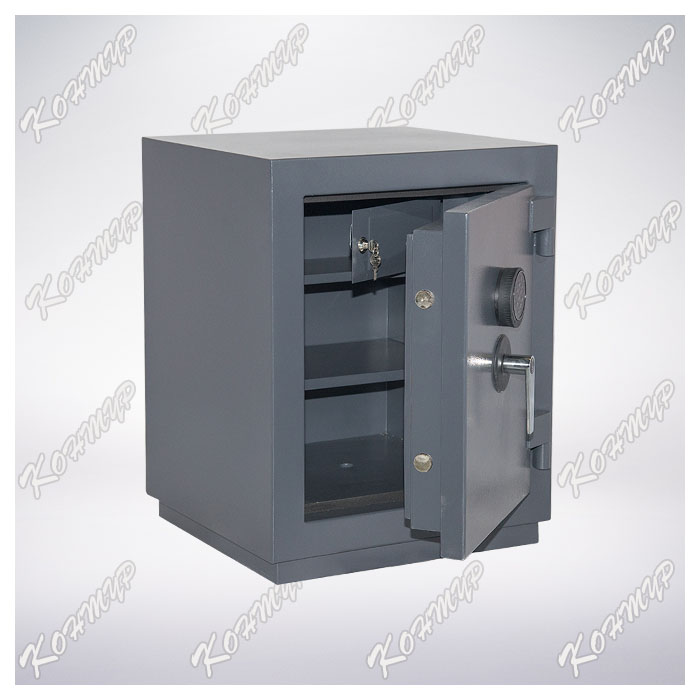 Внутри сейфа располагается отсек ограниченного доступа (трейзер), запираемый на замок «почтового» типа и одна съемная полка. В дне сейфа предусмотрено отверстие Ø11 мм для возможности анкерного крепления его к полу. Сейф оборудован запорным механизмом с ригельной системой запирания (4 ригеля Ø28 мм в сторону/1 вверх), который блокируется ключевым сейфовым замком класса «А» фирмы «CAWI» или «MAUER» производства Германии, а для дополнительной защиты — со стороны петель установлен пассивный П-образный ригель. Запорный механизм приводится в действие при помощи ручки. Чтобы открыть сейф необходимо: вставить ключ в замочную скважину, открыть замок и повернуть ручку на 90°. Закрывать в обратном порядке. Сейф от криминального взлома оборудован тросовой блокировочной системой запирания, механическое воздействие на которую не допустимо, т.к. это может привести к блокированию ригельной системы запирания. Петли сейфа наружные, открывание двери – на 180 °