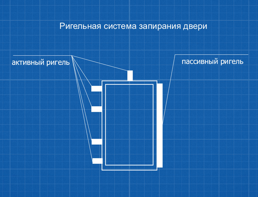 | Система запирания | Ригельная — 5 активных ригеля Ø28 мм (4 в сторону/1 вверх) и 1 пассивный П-образный ригель со стороны петель |
