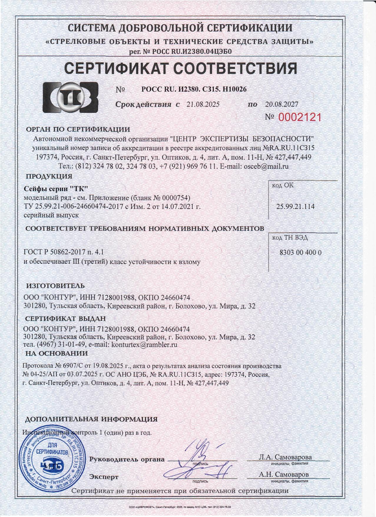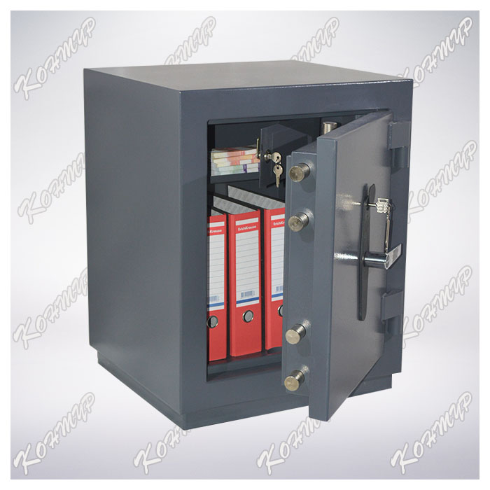 Сейф взломостойкий. Корпус сейфа изготовлен из цельнометаллических сваренных корпусов (внешний и внутренний) с наполнением. Пространство между корпусами заполнено специальным наполнителем, обеспечивающим надежность и прочность конструкции. Система запирания двери имеет 6 активных и один пассивный ригель со стороны петель. Сейф оборудован высококачественным запорным механизмом, который блокируется замком сувальдного типа (производство Германия), что обеспечивает необходимую для третьего класса надежность от взлома. Внутри сейфа имеется отсек ограниченного доступа — трейзер (внутренний ящик с замком почтового типа) и 1 полка. Предусмотрена возможность анкерного крепления к полу. Окраска полимерное покрытие.